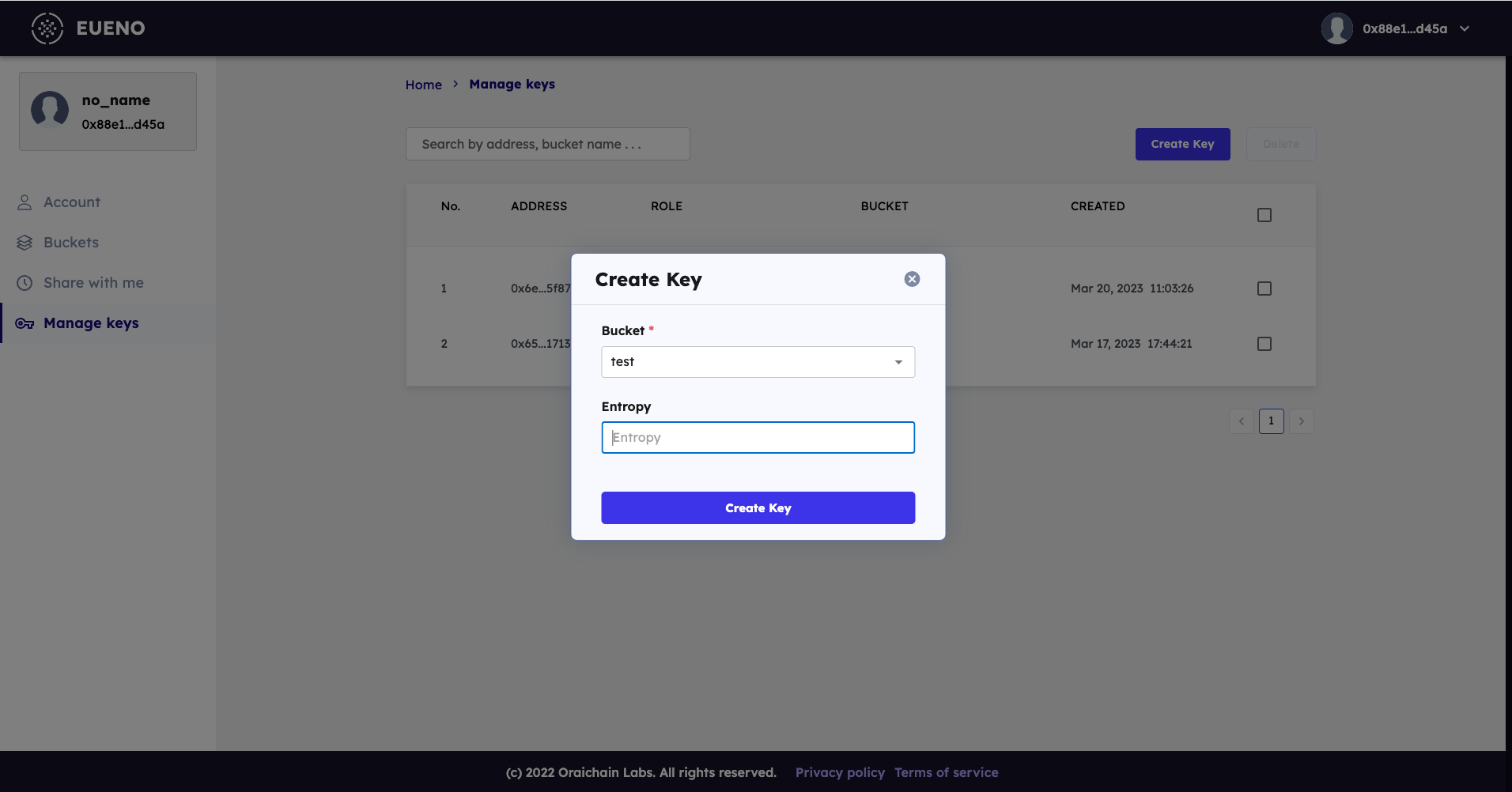 **Step 2**: Select the "Create Key" button, select your project and enter a random character to increase the security of the key. Then press generate the key.